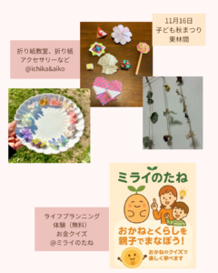 その他、🔸ライフプランニング体験(無料)、お金クイズ🔸折り紙教室、アクセサリー販売🔸温熱刺激療法イトオテルミ-など。